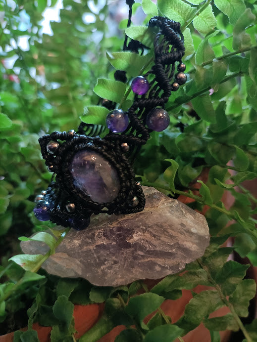 Bracelet en linhasita avec un joli cabochon d'améthyste, des perles d'améthyste et des perles en acier inoxydable.